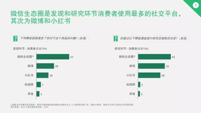 對社交渠道進一步分析,在“發現”和“研究”環節,包括朋友圈廣告、朋友分享、小程序和微信公眾號的微信生態圈是消費者使用最多的社交渠道,占比分別是52%和43%。