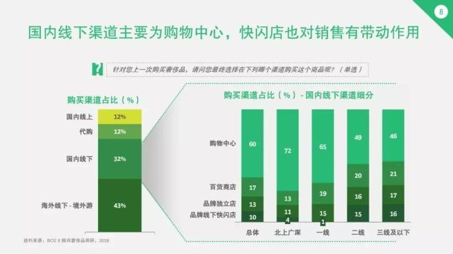 值得一提的是,隨著小程序的普及以及品牌公眾號運營的提升,品牌自營線上銷售渠道正在逐漸興起,占線上整體的三分之一,成為過去一年快速增長的新興渠道。