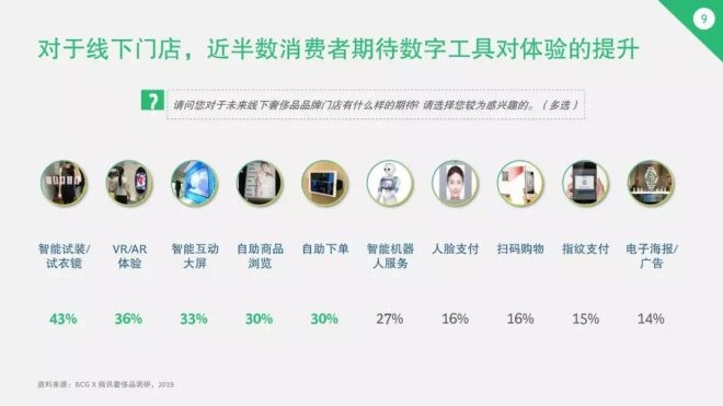 隨著線上線下融合趨勢越發明顯,消費者對線下的體驗也有了越來越高的要求。有30%以上的消費者表示期待品牌通過智能試裝、VR/AR體驗、智能互動屏、自助商品瀏覽和自助下單等技術手段,改善線下消費體驗。
