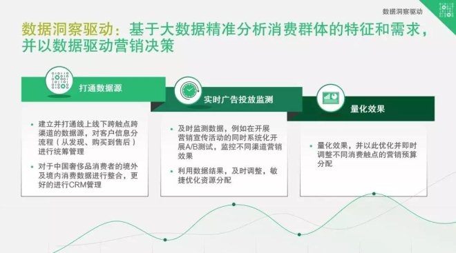 數據洞察驅動:基于大數據分析消費群體的特征和需求,并以商業數據洞察驅動營銷決策。數據洞察驅動的第一步是建立并打通線上線下跨觸點跨渠道的消費人群互動,對消費群體分流程(從發現、購買到售后)進行統籌管理。