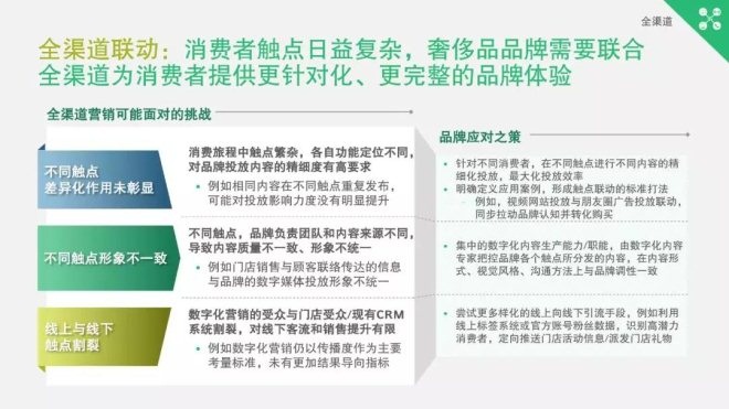 全渠道聯動:消費者觸點日益復雜和碎片化,奢侈品品牌需要聯合全渠道為消費者提供更針對化、更完整的品牌體驗。特別是觸點差異化不夠、形象不一致、線上線下割裂等挑戰。品牌需嘗試不同的應對之策。