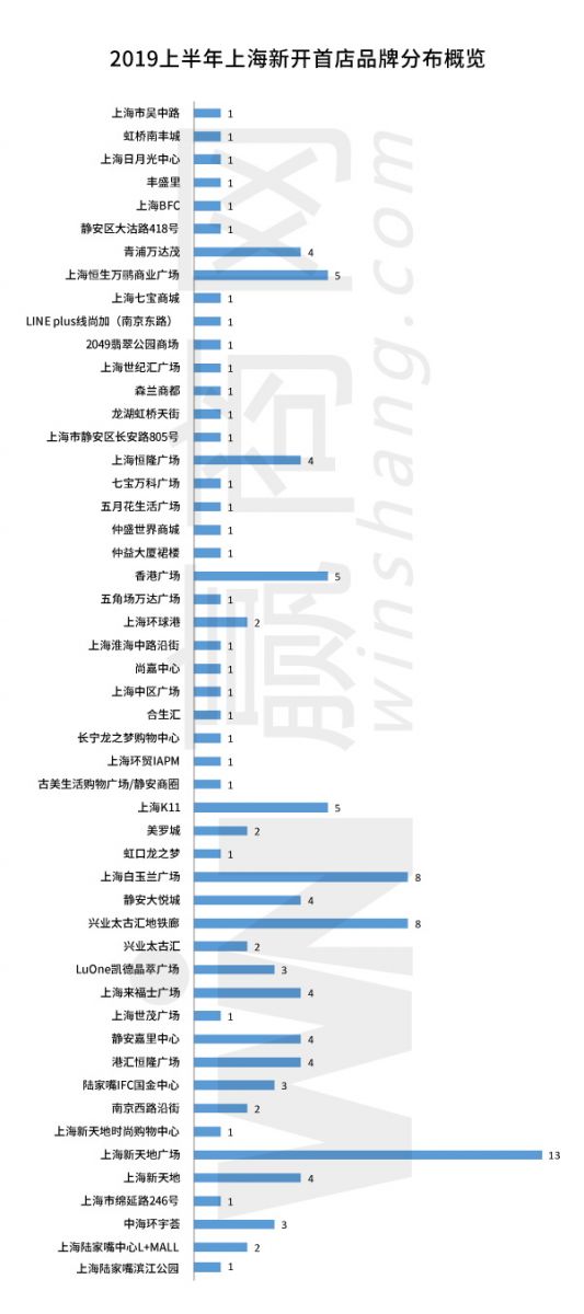 經(jīng)贏商網(wǎng)統(tǒng)計,2019上半年新開業(yè)項(xiàng)目共有11個,新開商業(yè)項(xiàng)目中的首店品牌共有38個,約占上半年開業(yè)的首店品牌總量的32%。其中,上海新天地廣場內(nèi)的首店品牌最多,共有13個,上海白玉蘭廣場和興業(yè)太古匯地鐵廊各有8個首店品牌于上半年亮相,上海恒生萬鸝商業(yè)廣場和青浦萬達(dá)茂上半年開業(yè)的首店品牌分別為5個、4個。