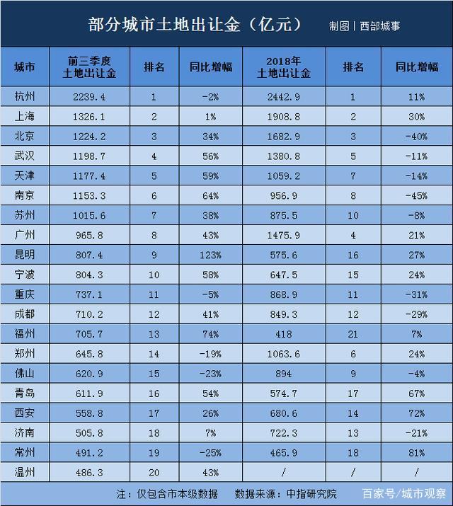 西部菌依據(jù)中指研究院等機(jī)構(gòu)的相關(guān)數(shù)據(jù),對(duì)前三季度的土地出讓金進(jìn)行了簡(jiǎn)單梳理,下圖是賣(mài)地收入TOP20城市的情況: