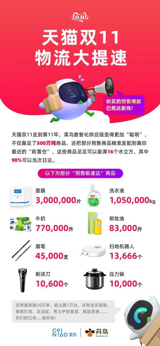 這是天貓、菜鳥、丹鳥聯合蒙牛、DHC、WIS、小米、立白、飛利浦、蘇泊爾等諸多品牌,一起創新的雙11物流新玩法——“預售極速達”。