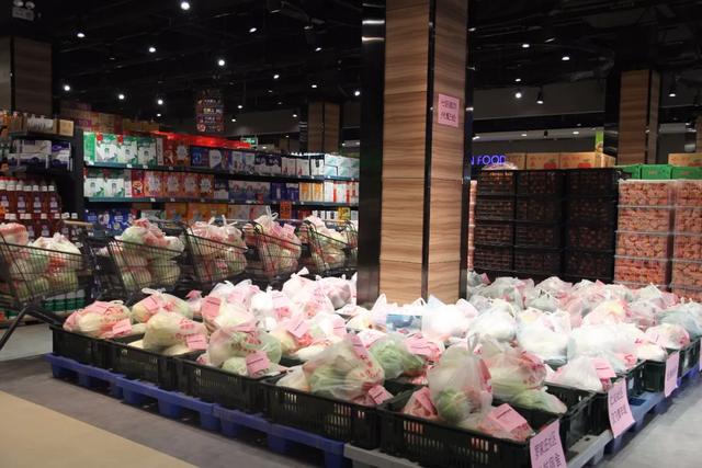 領導一行剛到賣場,正碰上工作人員往公交集團支援的配送車上搬運社區團購物資,應書記詳細詢問了車輛發往社區的路線和時間安排。進入賣場,領導一行仔細查看了團購作業區:一包包團購套餐規整打包,整齊列隊,按不同的社區整齊擺放。領導們詳細聽取工作人員匯報超市與社區對接團購套餐的工作情況,并俯身查看已打包好的團購物資。